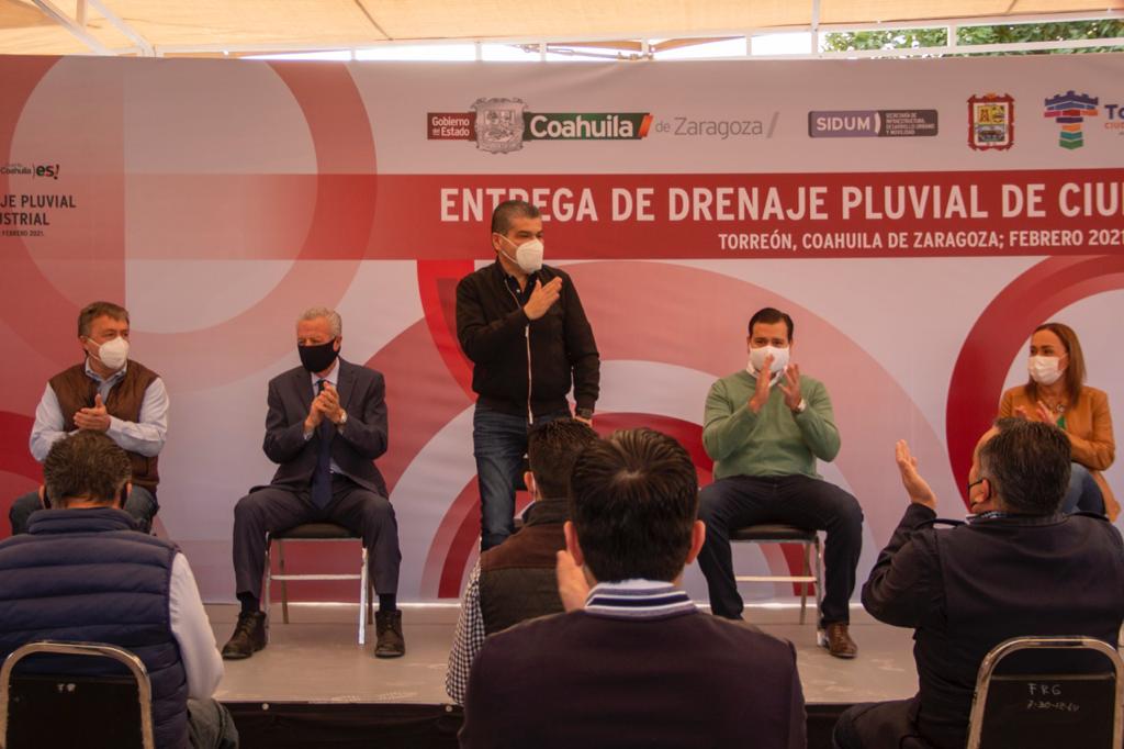 09 febrero 2021; Torreón, Coahuila.- El gobernador Miguel Ángel Riquelme Solís entregó el drenaje pluvial de Ciudad Industrial con inversión de 12.9 millones de pesos en su segunda etapa, y 24 millones de pesos en total.