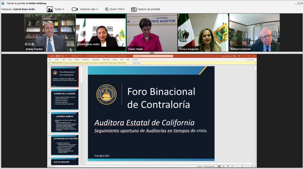 11 abril 2021; Saltillo, Coahuila.- La titular de la Secretaría de Fiscalización y Rendición de Cuentas de Coahuila (SEFIRC), participó como panelista en el Foro Binacional de Contralores y Auditores de México y Estados Unidos, coordinado por la Comisión Permanente de Contralores Estados-Federación (CPCE-F) y la Asociación Nacional de Auditores, Contralores y Tesoreros de Estado de Estados Unidos de América (NASACT, por sus siglas en inglés), donde se compartieron experiencias y buenas prácticas referentes a las actividades de fiscalización.