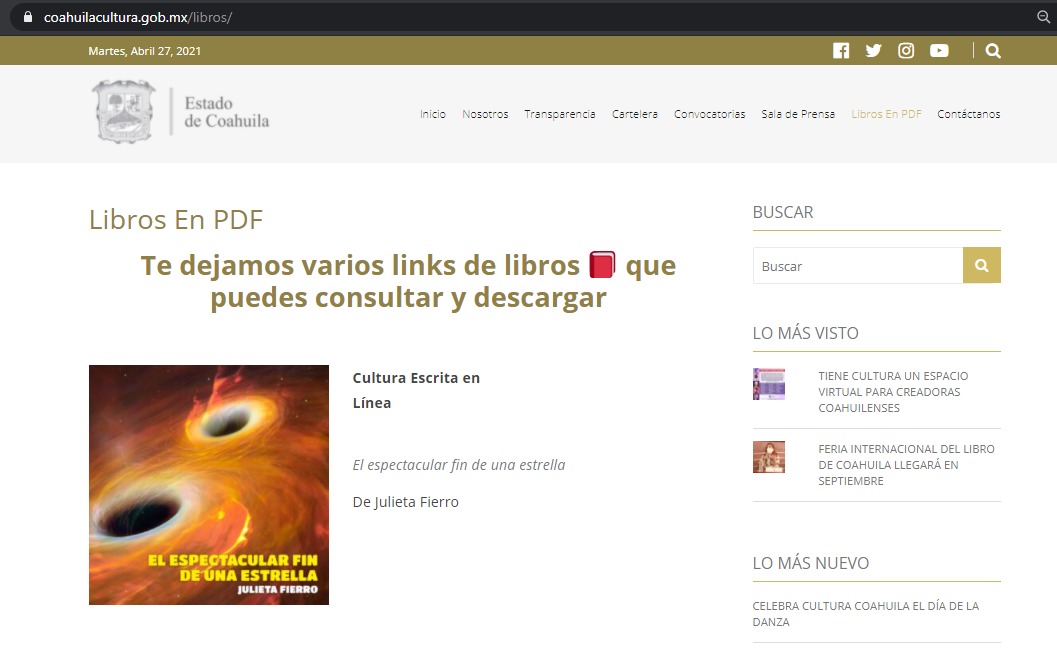 28 abril 2021; Saltillo, Coahuila.- La Secretaría de Cultura coahuilense (SC) dio a conocer que continúa vigente dentro de su página de internet https://coahuilacultura.gob.mx/libros-en-pdf/ el acceso gratuito para diferentes títulos literarios.