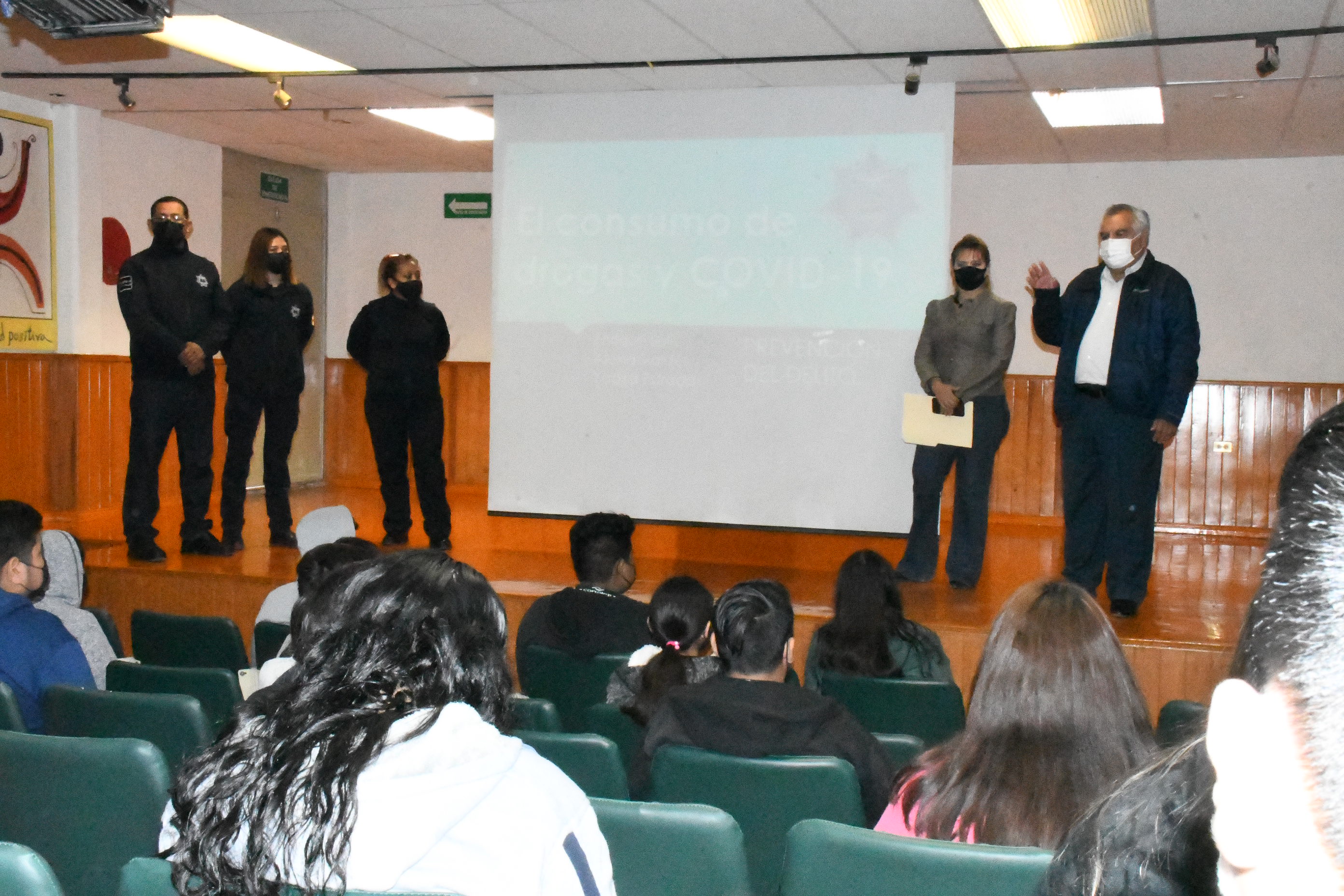 05 noviembre 2021; Monclova, Coahuila.-Ante el incremento de jóvenes que consumen sustancias ilegales, Seguridad Pública, en coordinación con el Conalep, llevaron a cabo una plática con estudiantes de este plantel, donde los temas fueron la el Covid 19 y la drogadicción.