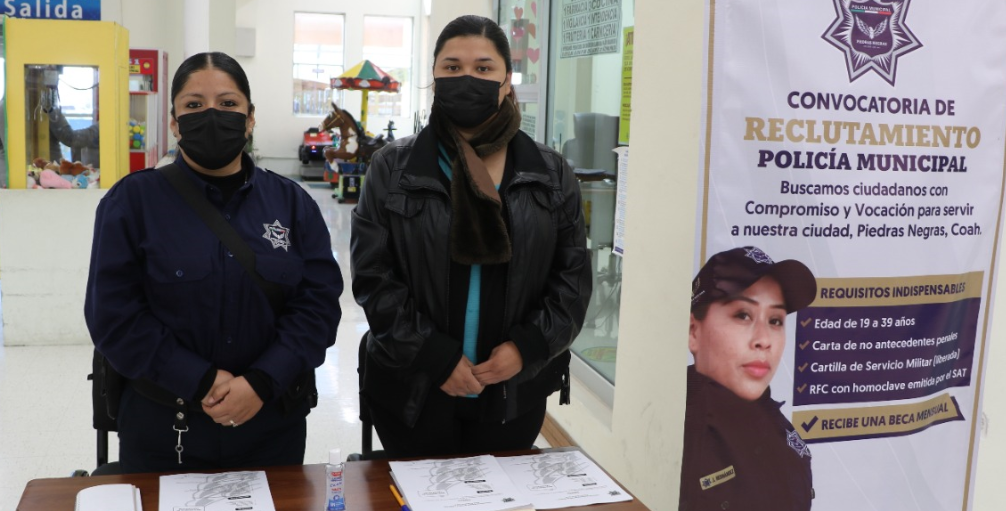 16 febrero 2022; Piedras Negras, Coahuila.-La Dirección de Seguridad Pública Municipal de Piedras Negras amplía el reclutamiento para la Academia de Policía con un módulo de información en el Centro Comercial Gutiérrez «Don Bosco».