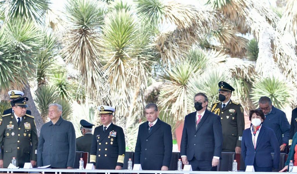 21 febrero 2022; Ramos Arizpe, Coahuila.- En la ex Hacienda de Guadalupe, el Presidente de México, Andrés Manuel López Obrador, acompañado del Gobernador de Coahuila, Miguel Ángel Riquelme Solís, encabezó la ceremonia conmemorativa del 109 Aniversario del Ejército Mexicano.