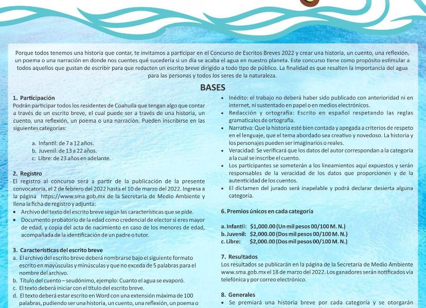 21 febrero 2022; Saltillo, Coahuila.-La Secretaría de Medio Ambiente (SMA) de Coahuila convoca a la población a participar en los concursos de Cuento Breve y de un ejercicio de tik-tok, video, con los temas “Y si el agua se acaba?” y “Reto H2O”, respectivamente, como parte de la Campaña “50 Días por el Agua”.