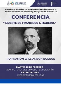 22 febrero 2022; Monclova, Coahuila.-La Dirección de Arte y Cultura en coordinación con el Archivo Municipal te invita a la conferencia MUERTE DE FRANCISCO I. MADERO presentada por RAMÓN WILLIAMSON BOSQUE.