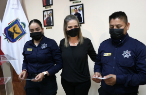 Alexy Itzayana García Ibarra y José Alfredo Hernández Benítez, fueron los elementos reconocidos que colocaron sus fotografías en la galería de honor y recibieron estímulo de manos de la Alcaldesa, quien además dijo seguir firme con el compromiso de brindar a los buenos policías dos seguros de vida, la tarjeta de apoyo a su economía y una beca escolar para uno de sus hijos.
