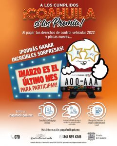08 marzo 2022; Saltillo, Coahuila.- Marzo es el último mes para participar por las grandes sorpresas que el Gobierno del Estado de Coahuila tiene para ti al cubrir tus derechos de control vehicular 2022 y placas nuevas.