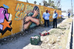 Para poder apreciar el mural, el alcalde se trasladó hasta el mencionado sector, en el sur de la ciudad, para felicitar personalmente al artista de grafiti de arte urbano, por esa importante aportación, que proyecta un mensaje muy llamativo que sin duda hará reflexionar a más de unas persona.