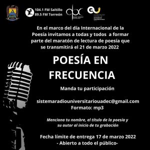 13 marzo 2022; Saltillo, Coahuila. Para celebrar el Día Internacional de la Poesía, la Universidad Autónoma de Coahuila invita a participar en el maratón de lectura “Poesía en Frecuencia”, con la grabación de audios, mismos que serán transmitidos el 21 de marzo por medio de las estaciones del Sistema de Radio Universitario en Saltillo 104.1 FM y en Torreón 89.5 FM.