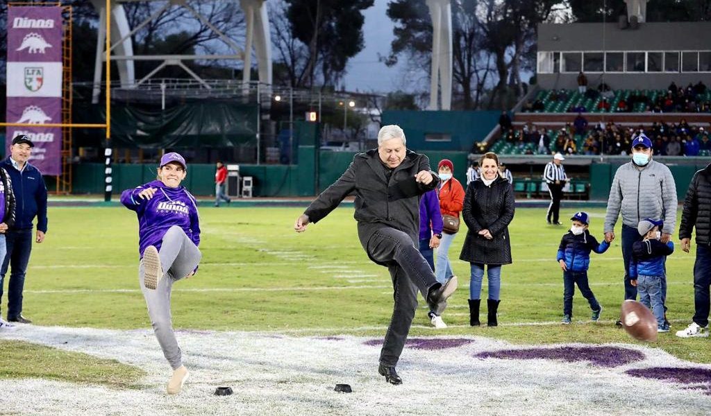 Acompañado de la directora del Instituto Estatal del Deporte en Coahuila, Alina Garza, ambos dieron la patada inicial al encuentro entre el equipo representativo de Saltillo, Los Dinos, que enfrentaron a los Fundidores de Monterrey, en el emparrillado del estadio Francisco I. Madero.