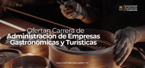 26 marzo 2022; Torreón, Coahuila-. La Universidad Autónoma de Coahuila, en concordancia con las necesidades del sector laboral y productivo de la región, ofrece la Licenciatura en Administración de Empresas Gastronómicas y Turísticas en la Facultad de Contaduría y Administración Unidad Torreón, para iniciar semestre en agosto de 2022.