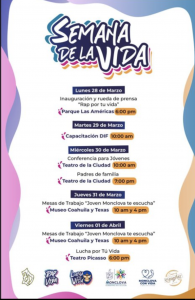 28 marzo 2022; Monclova, Coahuila.-Inicia “La Semana de La Vida”, evento que se llevará a cabo a partir de este día 28 de marzo para concluir el 01 de abril, el objetivo de este evento es promover la conservación de la vida, a través de conferencias dirigidas a jóvenes, como una forma de prevención, contra los efectos nocivos provocados por la depresión y las adicciones.