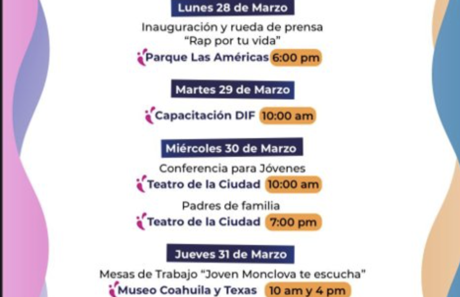 Y el viernes 01 de abril para cerrar actividades, el departamento de salud, en coordinación con el departamento de Juventud, llevaran a cabo mesas de trabajo, denominadas “Joven Monclova te Escucha”, esto será en dos horarios, 10:00 de la mañana y 4:00 de la tarde y a las 6:00 de la tarde cierran en el teatro Picasso, estarán cerrando con la obra de teatro, “Lucha por tu vida”.