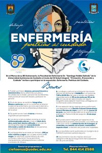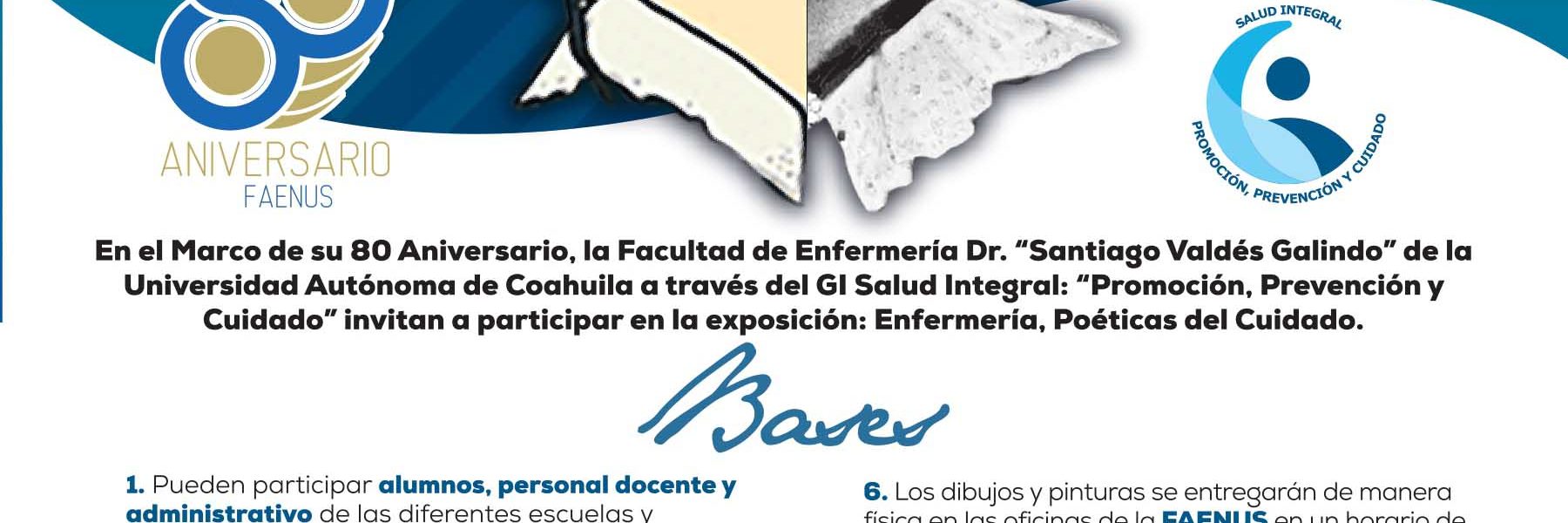 29 marzo 2022; Saltillo, Coahuila.- En el marco de su 80° aniversario, la Facultad de Enfermería “Dr. Santiago Valdés Galindo” de la Universidad Autónoma de Coahuila a través del Grupo de Investigación “Salud Integral: Promoción, Prevención y Cuidado”, invitan a participar en la exposición fotográfica “Enfermería, poéticas del cuidado”, registro hasta antes del 31 de mayo de 2022.