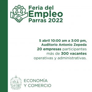 30 marzo 2022; Parras, Coahuila.-Te invitamos a participar en la Feria del Empleo Parras 2022, donde se darán cita 20 empresas locales y foráneas para ofrecer más de 300 vacantes en el área operativa y administrativa.