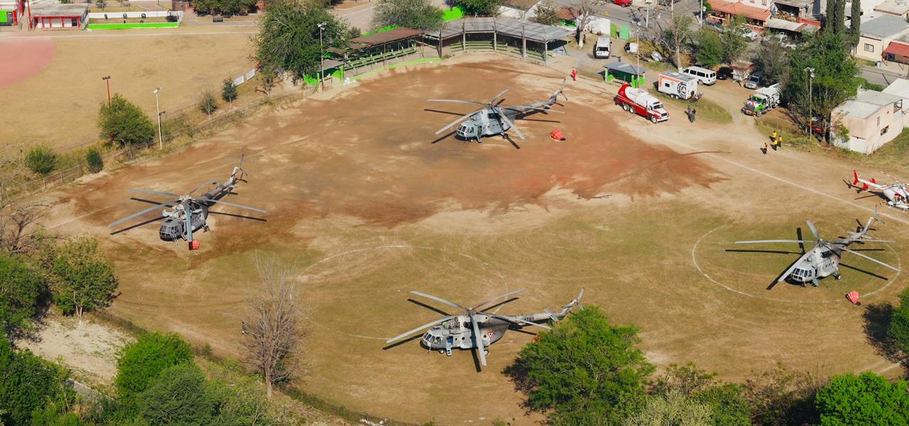 Informó que se identificó en el paraje “Lagunillas” y Mesa del Oso a cuatro helicópteros MI17, H. UHU, aeronave 206 del Gobierno del Estado de Coahuila, laborando en el sitio y realizando descargas.