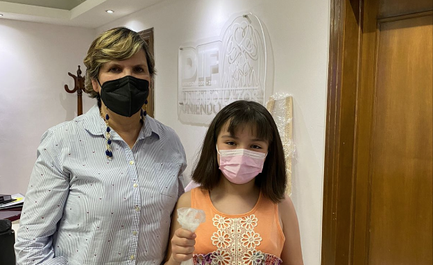 Fue así como luego de su entrevista con la doctora Leticia Carrillo, la pequeña pasó a entregar sus dos trenzas, las cuales fueron recibidas por la directora del DIF doctora Cecilia Ramos Cardona y la coordinadora de programas del DIF Alma Guerra.