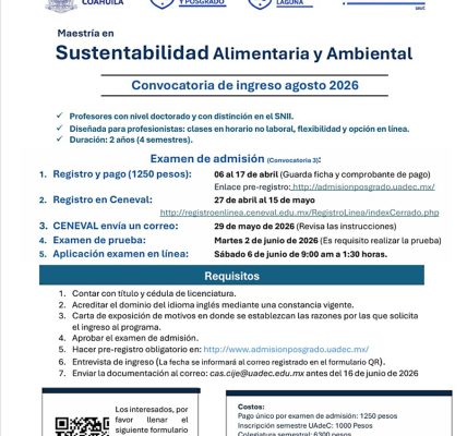 09 abril 2022; Arteaga, Coahuila.- La Facultad de Arquitectura de la Universidad Autónoma de Coahuila, invita a formar parte de la cuarta generación del Doctorado en Arquitectura y Urbanismo (DAU) impartido en modalidad en línea y con duración de ocho semestres, el registro de aspirantes para el semestre agosto-diciembre 2022 está disponible hasta el 29 de abril.