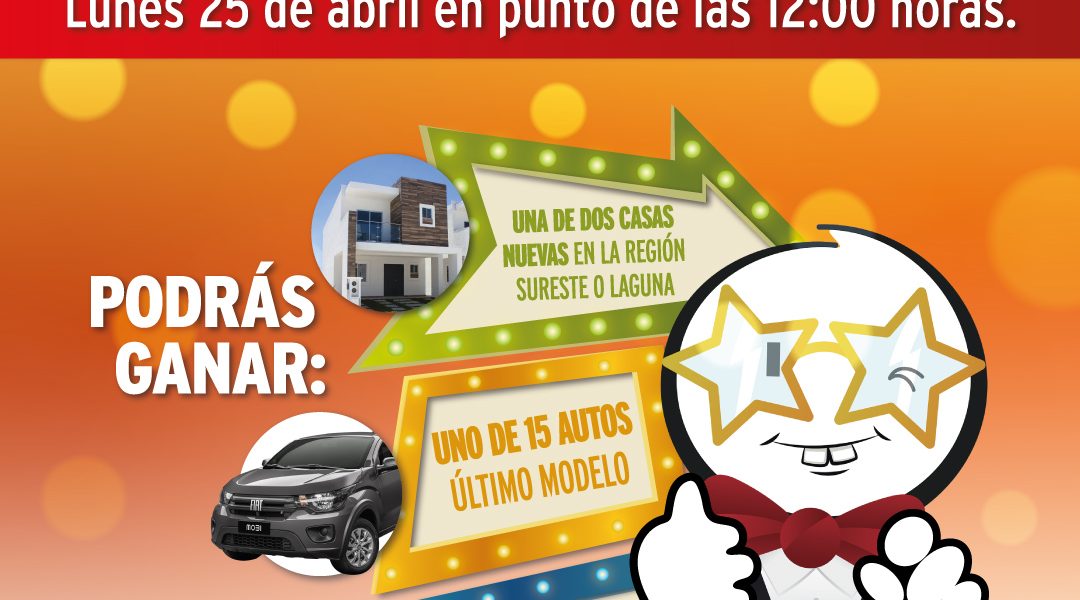Se sortearán 57 premios en total, una casa en Torreón y otra en la Región Sureste, 15 vehículos (Fiat Mobi Like 2022, 3 por región), 40 premios de 50 mil pesos (8 por región) en cheque certificado.