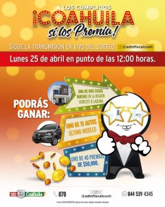 23 Abril 2022; Saltillo, Coahuila de Zaragoza.- El Gobierno del Estado de Coahuila, a través de la Administración Fiscal General (AFG), te invita a que sigas la transmisión en vivo del sorteo “A los Cumplidos Coahuila Sí los Premia”.