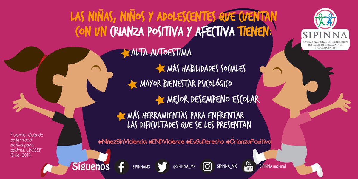 En cambio, explicó, la crianza positiva y el buen trato generan apego seguro, empatía, habilidades, conocimientos y comportamientos sociales altruistas en niñas, niños y adolescentes; además les permiten manejar mejor los deseos y las frustraciones, desempeñarse socialmente y desarrollar una identidad individual y social.