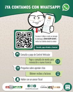 “A los contribuyentes que deseen conocer su situación de control vehicular, agendar una cita o recibir asistencia fiscal, los seguimos invitando a que lo realicen desde la comodidad de su celular enviando un mensaje al WhatsApp de la AFG al 844 539 4345”, concluyó, Díaz González.