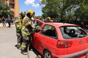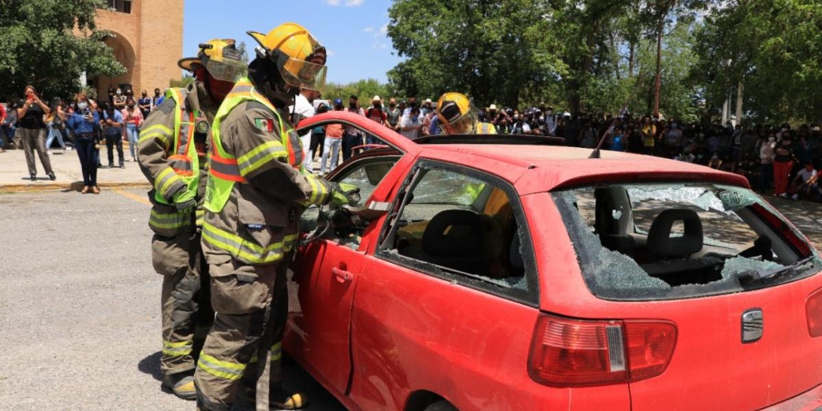 03 mayo 2022; Saltillo, Coahuila.- A fin de concientizar a los jóvenes sobre los riesgos de manejar en estado de ebriedad, haciendo uso del celular o a exceso de velocidad, se llevó a cabo un simulacro de accidente del programa ¡Ya bájale! Cuidemos la Vida, en las instalaciones de la Universidad Autónoma Agraria Antonio Narro.