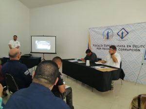 En la sala audiovisual de presidencia municipal, con la presencia del Mtro. Jesús Homero Flores Mier, Fiscal Especializado en Delitos por Hechos de Corrupción y del Secretario del Ayuntamiento, Alberto de Luna Sánchez; el capacitador, Mtro. Gil Ballesteros, de la Fiscalía General del Estado, brindó la información a los funcionarios reunidos.