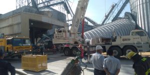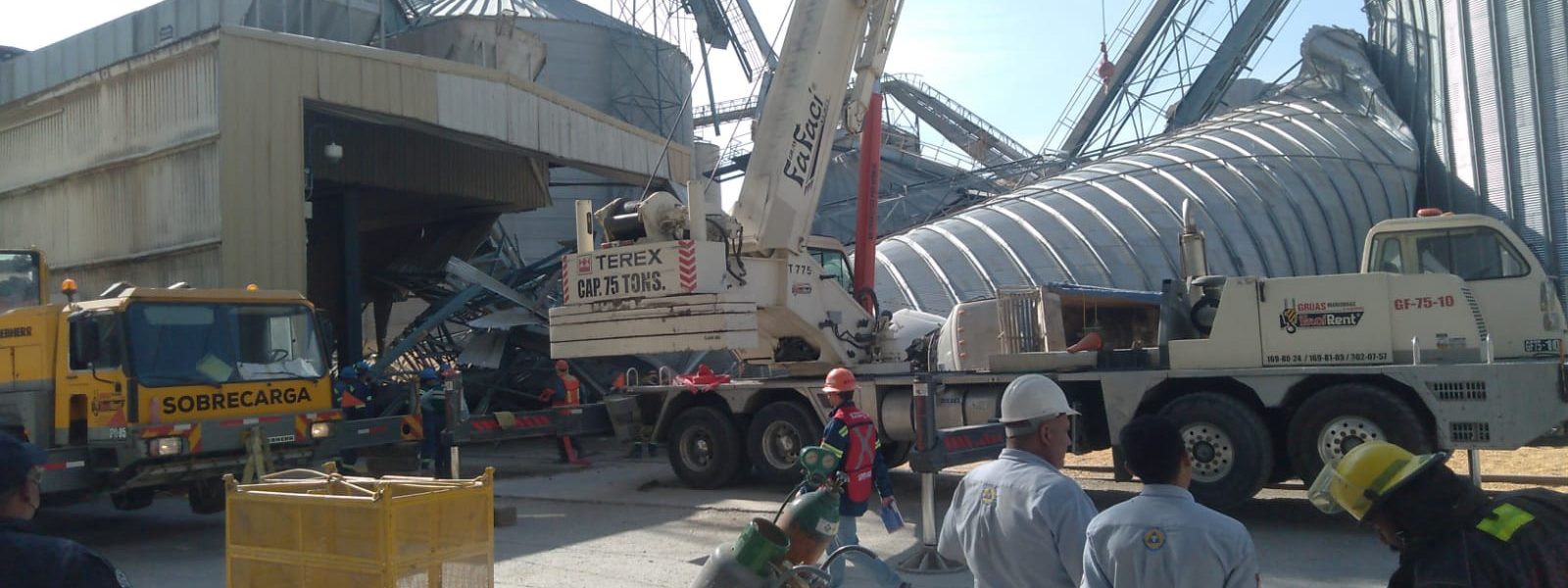 Se utiliza la grúa de 110 toneladas para anclar y sostener una banda transportadora, y con ayuda de otra grúa de 75 toneladas, sostener las partes a seccionar y cortar; esto, para liberar peso del área afectada.
