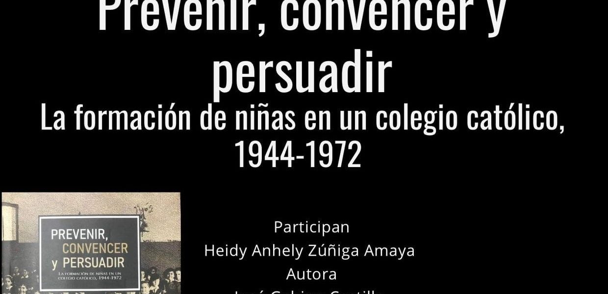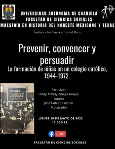 19 mayo 2022; Saltillo, Coahuila.- La Universidad Autónoma de Coahuila, a través de la Facultad de Ciencias Sociales, invita a docentes, alumnos y público en general a la charla virtual del libro “Prevenir, Convencer y Persuadir, La Formación de Niñas en un Colegio Católico, 1944-1972”, en la que participarán la autora Heidy Anhely Zúñiga Amaya y el coordinador de Posgrado, José Gabino Castillo Flores como moderador.
