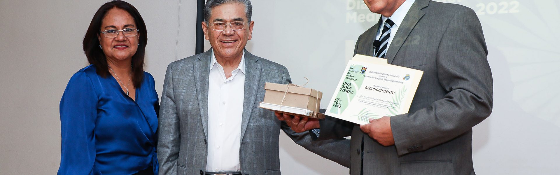 07 junio 2022; Saltillo, Coahuila.- En el marco del Día Mundial del Medio Ambiente 2022, el rector de la Universidad Autónoma de Coahuila, Salvador Hernández Vélez, y la coordinadora de la Agenda Ambiental Universitaria, Graciela Hernández Gómez, inauguraron el ciclo de conferencias “Una Sola Tierra”, en el auditorio de la Facultad de Ciencias Químicas.