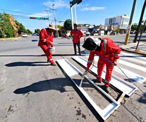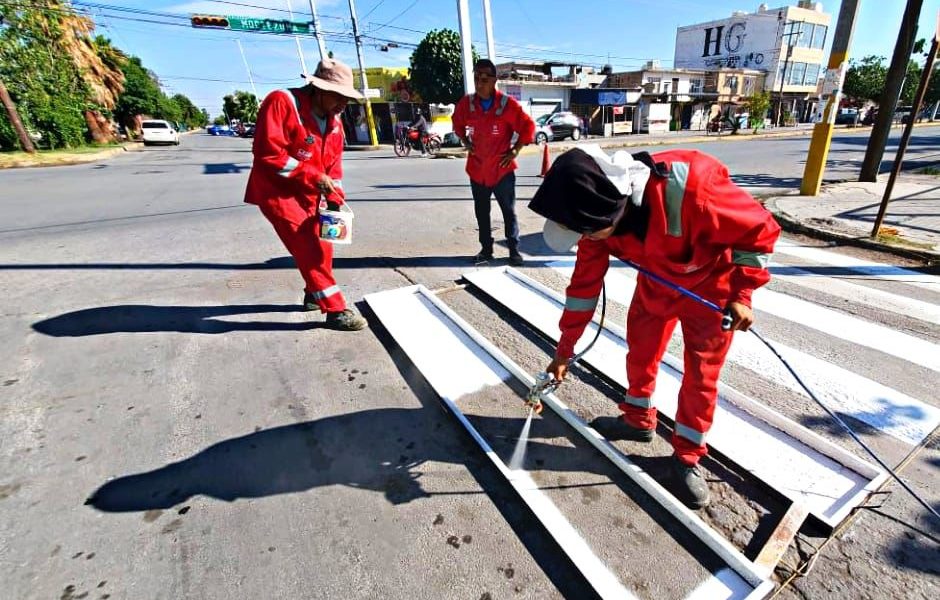 08 junio 2022; Torreón, Coahuila.-El Sistema Integral de Mantenimiento Vial (SIMV), continúa trabajando en el mejoramiento de las calles y avenidas del municipio. En lo que va del mes de junio se ha realizado el trabajo de pintura de seis pasos peatonales y tres líneas de alto, en la escuela primaria federal “Ricardo Flores Magón”, ubicada en la calzada Moctezuma y Xochimilco en la colonia Carolinas.
