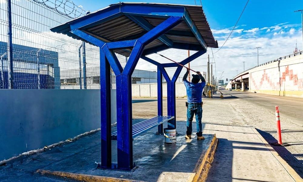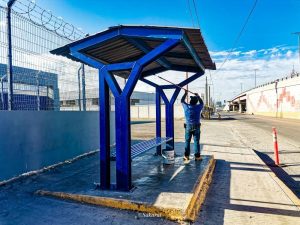 20 junio 2022; Monclova, Coahuila.-El Ayuntamiento de Monclova a través del departamento de Transporte y Vialidad, dio mantenimiento a los parabuses que se encuentran instalados en las principales avenidas, con el fin de que los usuarios del transporte público, puedan protegerse de los rayos del sol.