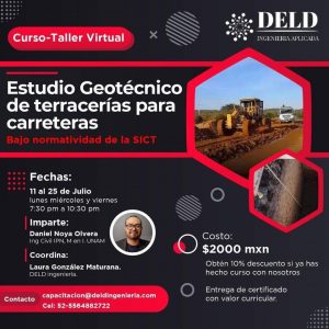Está dirigido a estudiantes o profesionistas del ámbito de la ingeniería; en el curso se podrá elaborar el estudio geotécnico para las terracerías de un proyecto carretero, calcular pruebas de laboratorio, determinar parámetros necesarios para el cálculo de los volúmenes de tierra y recomendaciones para obras de drenaje, taludes, entre otros, se abordarán los contenidos con base en las normas de la Secretaría de Infraestructura, Comunicaciones y Transportes del Gobierno federal.