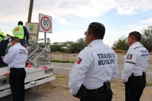 30 junio 2022; Torreón, Coahuila.-Con apoyo del personal de la Dirección General de Servicios Públicos, la Dirección General de Vialidad y Movilidad Urbana, dio inicio a las labores de colocación de los nuevos señalamientos restrictivos de velocidad de 80 kilómetros por hora a lo largo del bulevar La Nogalera, en el tramo que va del llamado Nudo Mixteco, hasta el cruce de la vieja rúa a San Pedro.