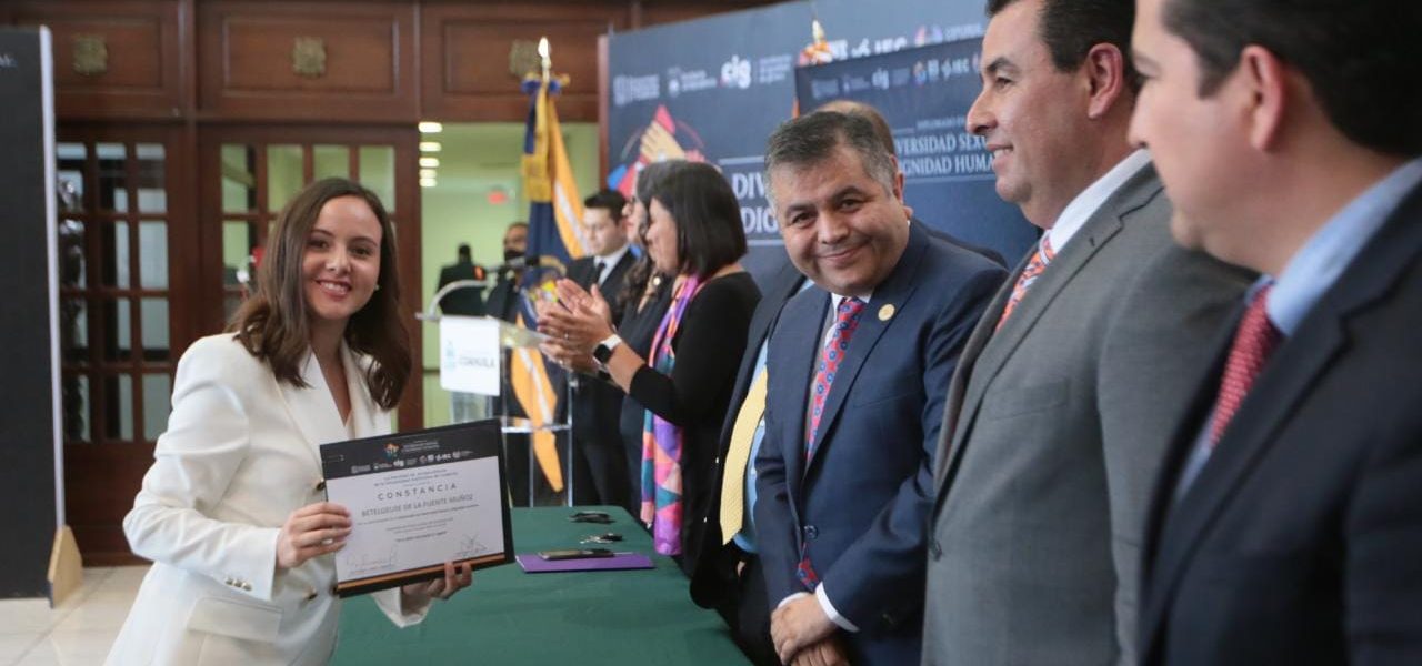 En esta ceremonia de graduación de la Primera Generación del Diplomado “Diversidad Sexual y Dignidad Humana” estuvieron presentes, además, Patricia Esther Yeverino, Directora para Promover la Igualdad y Prevenir la Discriminación en el Estado; Carlos Estrada Flores, Secretario del Ayuntamiento de Saltillo; Víctor Manuel Sánchez Valdez, Coordinador General de Extensión Universitaria de la UAdeC, y Magdalena Jaime Cepeda, Coordinadora de Igualdad de Género de la UAdeC.