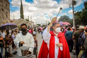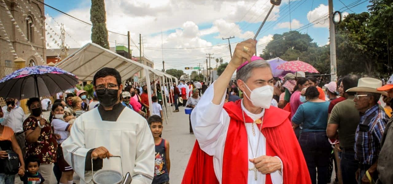 El Obispo Luis Martín Barraza Beltrán fue el encargado de bendecir los alimentos, acompañado del párroco Isidro Chávez Frausto, la Presidenta Honoraria del DIF San Pedro Caro Fuentes Rubio en representación del Alcalde David Ruiz Mejía y el Cronista de la Ciudad Luis Martín Tavarez Gutiérrez.