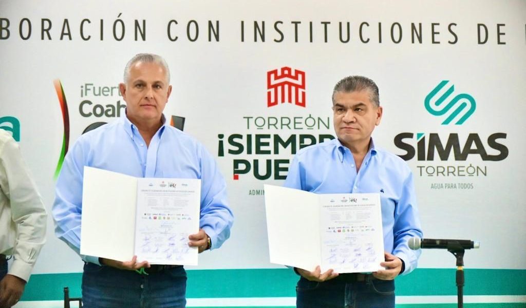 09 julio 2022; Torreón, Coahuila.- El alcalde de Torreón Román Alberto Cepeda González y el Gobernador de Coahuila, Miguel Ángel Riquelme Solís, firmaron un convenio con la Comunidad de Instituciones de Educación Superior de la Laguna (CIESLAG), para fortalecer el plan estratégico de 12 acciones para que Torreón tenga agua para todos.