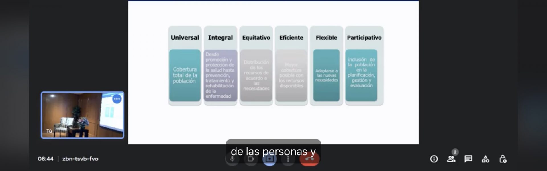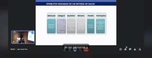 Por otro lado, explicó que los atributos de un sistema de salud es que sea Universal: cobertura total de la población; Integral: desde promoción y protección de salud, hasta prevención, tratamiento y rehabilitación de la enfermedad; Equitativo: distribución de los recursos de acuerdo a las necesidades; Eficiente: mayor cobertura posible con los recursos disponibles; Flexible: adaptarse a las nuevas necesidades y Participativo: inclusión de la población en la planificación, gestión y evaluación.