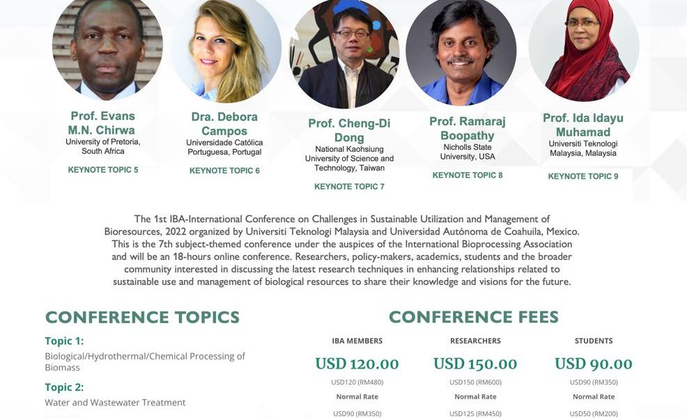 Los interesados en participar deberán de registrarse en https://form.jotform.com/220979183723464, los costos para miembros de la IBA es de $120,00 USD, investigadores 150,00 USD y para estudiantes 90,00 USD; para más información visitar la página https://engineering.utm.my/chemicalenergy/iba-sumbio2022/ o escribir al correo iba-sumbio@utm.my.