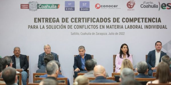 AVANZA COAHUILA HACIA LA IMPLEMENTACIÓN DE LA NUEVA REFORMA LABORAL: MARS Por Jorge Moreno 15 julio 2022; Saltillo, Coahuila.- El gobernador Miguel Ángel Riquelme Solís entregó certificados en la Competencia EC 1374, “Conciliación para la solución de conflictos en materia…