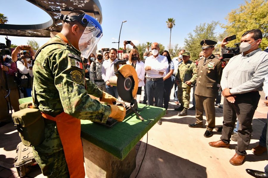 02 agosto 2022; Monclova, Coahuila.-El alcalde, Dr. Mario Dávila Delgado, y el Coronel de Infantería, diplomado del Estado Mayor, Gerardo Reyes Fuentes, comandante del 105 Batallón de Infantería, encabezaron, la ceremonia de inicio de la campaña de “Canje de Armas de Fuego”, que estará vigente, durante los siguientes tres meses.