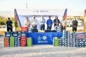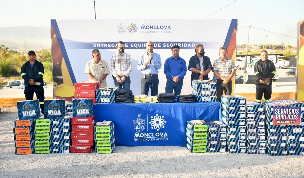 05 agosto 2022; Monclova, Coahuila.-Porque la seguridad de los trabajadores municipales es primero, el alcalde, Dr. Mario Dávila Delgado, acompañado por el Secretario General de los trabajadores Burócratas, al Servicio del Municipio, Jesús Rivera Quintero, hizo entrega de zapatos de seguridad, chalecos y guantes, a los trabajadores de Servicios Primarios, Limpieza y Barrido a mano, Forestación, Alumbrado, Obras públicas, Ecoparque, Panteones y Mantenimiento.