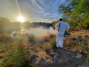13 agosto 2022; San Pedro, Coahuila.-Con el propósito de prevenir la presencia del mosquito transmisor del dengue, el personal de vectores, en coordinación con Jurisdicción Sanitaria número 7, realizaron trabajos de abatización en las vegas de San Pedro, dónde hubo acumulación de agua por la reciente lluvia, aplicando abate líquido, así como el uso de la termo nebulizadora que es la aplicación de insecticida de contacto.