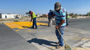20 agosto 2022; Parras, Coahuila.-Para seguridad de los Parrenses y turistas nuestro equipo de Infraestructura, Desarrollo Urbano y Movilidad pintó los reductores de velocidad de la Carretera Parras Paila, informó el alcalde Fernando Orozco Lara