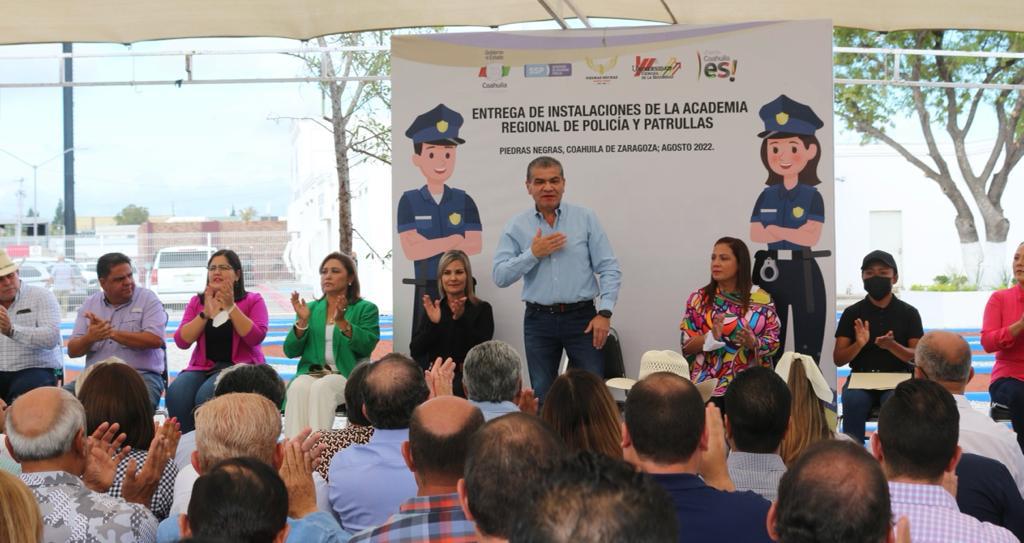 24 agosto 2022; Piedras Negras, Coahuila.- Al destacar los índices que ubican al Estado en los primeros sitios de seguridad en el País, el gobernador Miguel Ángel Riquelme Solís entregó las instalaciones de la Academia Regional de Seguridad Pública y ocho patrullas a la corporación de Seguridad Pública Municipal, con inversión total superior a los 16 millones de pesos.