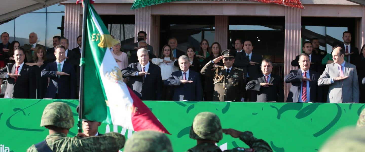 Lo anterior lo mencionó al presidir el Desfile Cívico-Militar realizado en Saltillo, en donde estuvo acompañado por General de Brigada D.E.M. Gabriel Martínez García, Comandante de la VI Zona Militar; José María Frausto Siller, Alcalde de Saltillo, y los representantes de los Poderes Judicial y Legislativo en la entidad: Miguel Felipe Mery Ayup, Magistrado Presidente del Tribunal Superior de Justicia del Estado, y Eduardo Olmos Castro, Diputado Presidente de la Junta de Gobierno del Congreso del Estado.