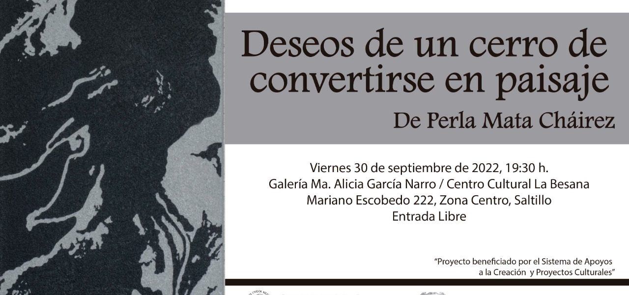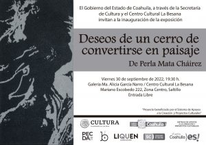 24 septiembre 2022; Saltillo, Coahuila.- La Secretaría de Cultura de Coahuila (SC), a través del Museo de Artes Gráficas, invita a la exposición “Deseos de un cerro de convertirse en paisaje”, de Perla Mata, que se llevará a cabo este 30 de septiembre en el Centro Cultural La Besana a las 19:30 horas, en la Galería María Alicia García Narro y es apta para todo público con entrada gratuita.