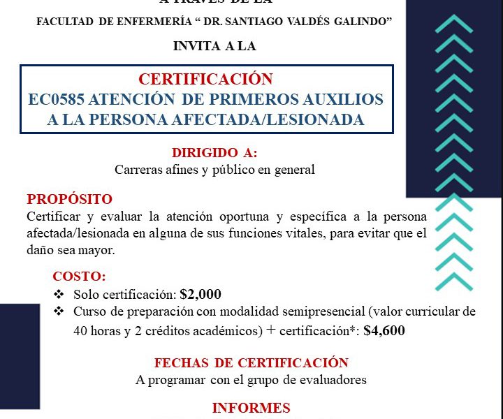 28 septiembre 2022; Saltillo, Coahuila.- La Universidad Autónoma de Coahuila a través de la Facultad de Enfermería “Dr. Santiago Valdés Galindo” pone a disposición la Certificación y Curso de preparación del ECO585 Atención de Primeros Auxilios a la persona afectada o lesionada.