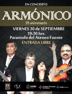 29 septiembre 2022; Saltillo, Coahuila.- La Universidad Autónoma de Coahuila a través de la Coordinación General de Difusión y Patrimonio Cultural, invita a la comunidad universitaria y público en general a disfrutar del concierto “Armónico 35 aniversario”, que se llevará a cabo este viernes 30 de septiembre en el Paraninfo del Ateneo Fuente a las 19:30 horas, la entrada es libre.