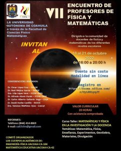 06 octubre 2022; Saltillo, Coahuila.- La Facultad de Ciencias Físico Matemáticas de la Universidad Autónoma de Coahuila, invita al VII Encuentro de Profesores de Física y Matemáticas, el cual se llevará a cabo del 18 al 21 de octubre de 2022 de 16:00 a 20:00 horas de manera virtual a través de la plataforma Microsoft Teams.